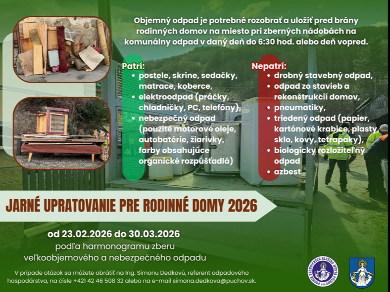 Jarné upratovanie pre rodinné domy bude prebiehať od 23.02.2026 do 30.03.2026 podľa zverejneného harmonogramu zberu veľkoobjemového a nebezpečného odpadu.